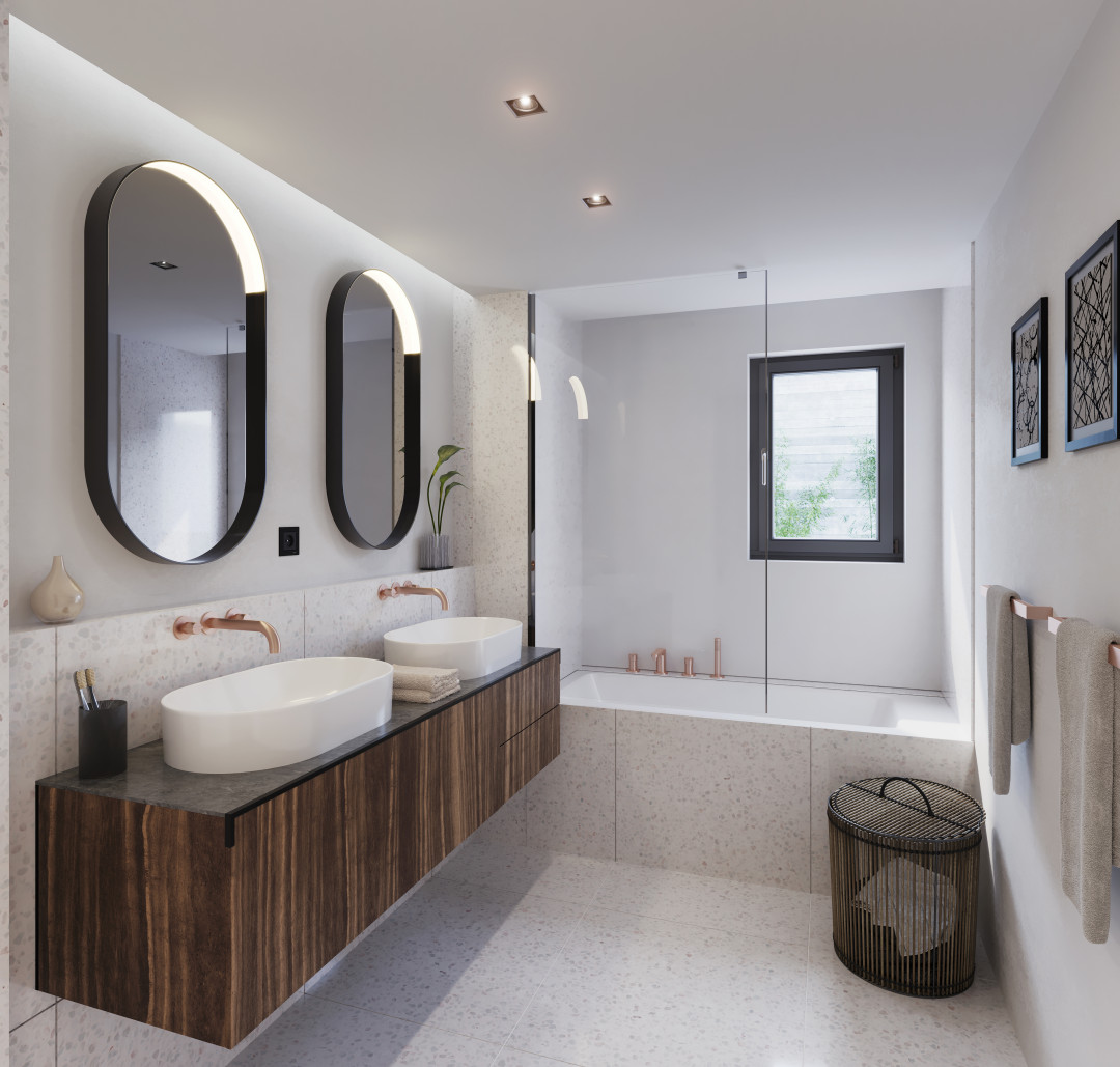 - Une collection de carrelage haut de gamme pour les sanitaires avec des faïences sur 4 pans de murs et toute hauteur dans la salle de bain et la salle d’eau